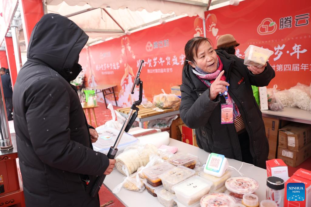 The marketplace drew tens of thousands of visitors on the opening day, with agricultural specialties, local delicacies, children's entertainment, Qinqiang opera performances, and intangible cultural heritage experiences. There were also hundreds of social media influencers broadcasting the bustling market via live-streaming, and collaborating with on-site vendors to promote local high-quality agricultural products, in an effort to activate holiday consumption potential. (Photo by Wang Kexian/Xinhua)