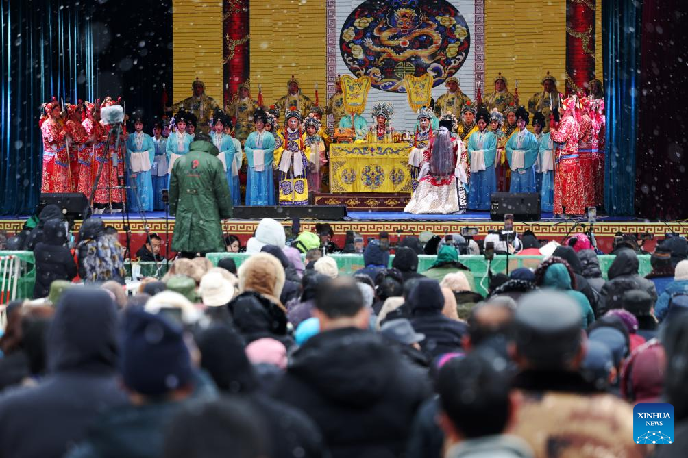 People watch a Qinqiang opera performance at a Spring Festival shopping market in Anding District of Dingxi City, northwest China's Gansu Province, Jan. 19, 2026. The Spring Festival shopping market opened its doors at the potato trading center in Anding District of Dingxi City on Monday and will run until Chinese Lunar New Year's Eve.