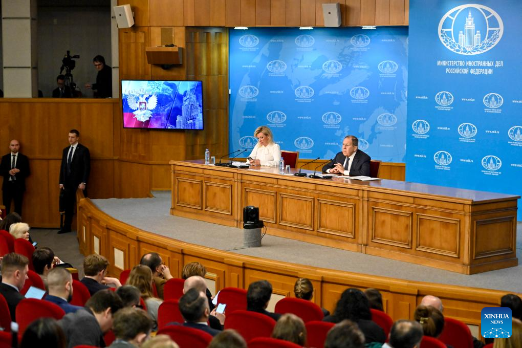Russian Foreign Minister Sergei Lavrov (R) answers questions during his annual press conference in Moscow, Russia, Jan. 20, 2026. (Photo by Alexander Zemlianichenko Jr/Xinhua)