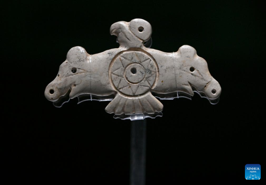 This photo taken on May 16, 2025 shows a jade eagle on display at the Lingjiatan Site Museum in Hanshan County, Ma'anshan, east China's Anhui Province. Dating back some 5,300 to 5,800 years, the Lingjiatan relic site in east China's Anhui was discovered in 1985. It is known for the jadeware unearthed there. The findings include jade artifacts in various shapes, offering a peek into the spirits and aesthetics of a prehistoric Chinese jade culture. (Xinhua/Huang Bohan)
