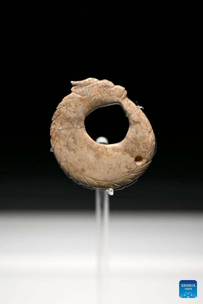 This photo taken on May 16, 2025 shows a jade dragon on display at the Lingjiatan Site Museum in Hanshan County, Ma'anshan, east China's Anhui Province. Dating back some 5,300 to 5,800 years, the Lingjiatan relic site in east China's Anhui was discovered in 1985. It is known for the jadeware unearthed there. The findings include jade artifacts in various shapes, offering a peek into the spirits and aesthetics of a prehistoric Chinese jade culture. (Xinhua/Huang Bohan)