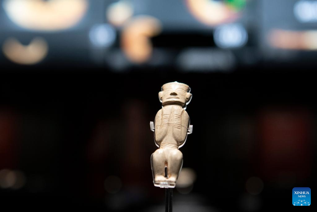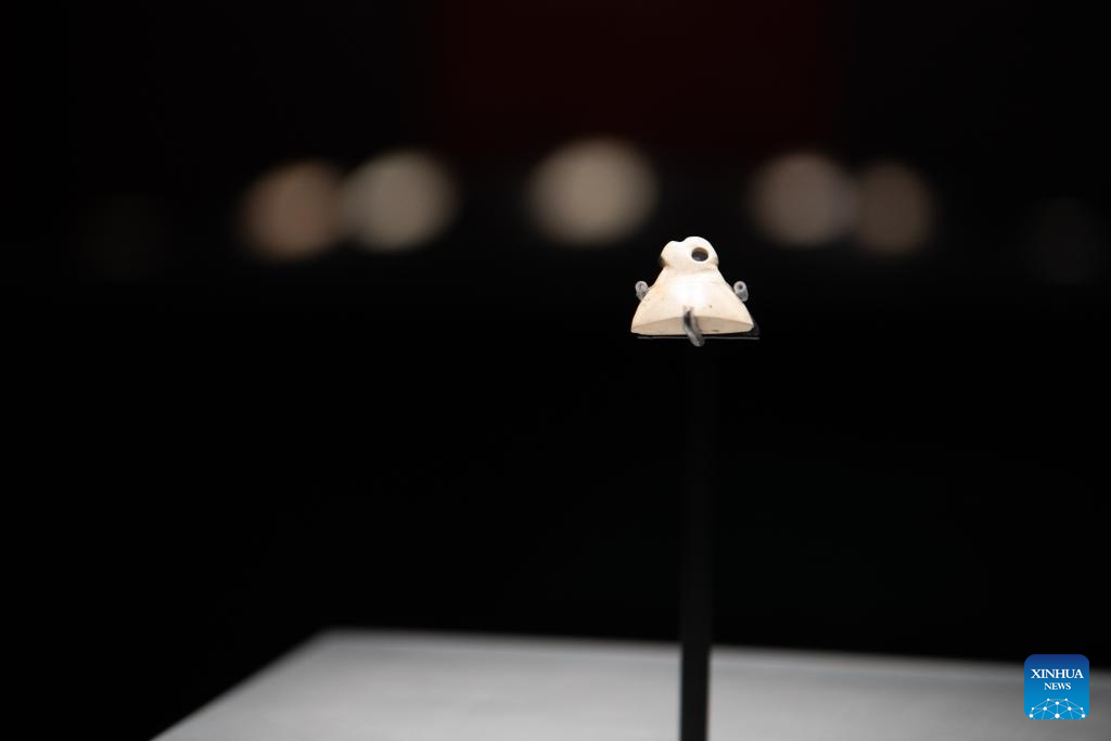 This photo taken on May 16, 2025 shows a jade figurine on display at the Lingjiatan Site Museum in Hanshan County, Ma'anshan, east China's Anhui Province. Dating back some 5,300 to 5,800 years, the Lingjiatan relic site in east China's Anhui was discovered in 1985. It is known for the jadeware unearthed there. The findings include jade artifacts in various shapes, offering a peek into the spirits and aesthetics of a prehistoric Chinese jade culture. (Xinhua/Zhang Duan)