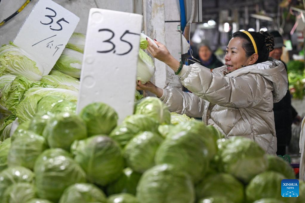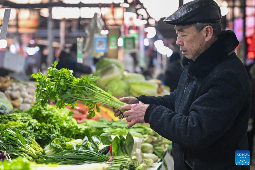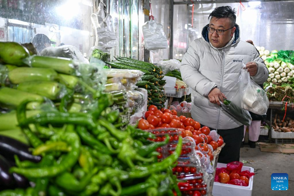 A man buys vegetables at an agricultural products market in Urumqi, northwest China's Xinjiang Uygur Autonomous Region, Jan. 20, 2026. A massive cold wave has hit northwest China's Xinjiang Uygur Autonomous Region recently, causing sharp temperature drops. Authorities across sectors in the region have worked in coordination to ensure an ample supply of vegetables and fruits.