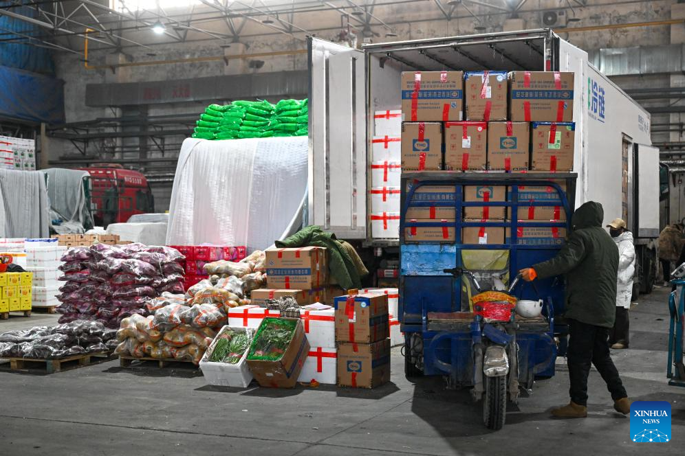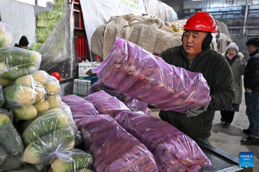 A vendor transports fresh vegetables at the Jiuding agricultural products wholesale market in Urumqi, northwest China's Xinjiang Uygur Autonomous Region, Jan. 19, 2026. A massive cold wave has hit northwest China's Xinjiang Uygur Autonomous Region recently, causing sharp temperature drops. Authorities across sectors in the region have worked in coordination to ensure an ample supply of vegetables and fruits.