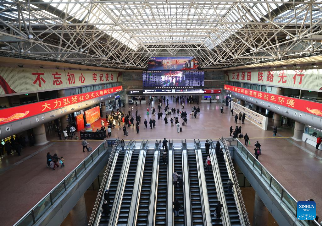 Passengers take photos at the Beijing West Railway Station in Beijing, capital of China, on Jan. 21, 2026. The Beijing West Railway Station marked its 30th anniversary on Wednesday. Over the past three decades, this modern transport hub has handled more than 1.96 billion passenger trips, standing as a witness to China's development and the evolution of its railway network. (Xinhua/Zhang Chenlin)