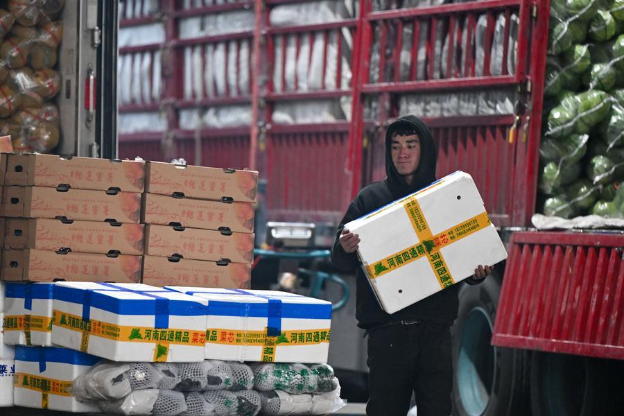 URUMQI, Jan. 21 (Xinhua) -- A massive cold wave has hit northwest China's Xinjiang Uygur Autonomous Region recently, causing sharp temperature drops. Authorities across sectors in the region have worked in coordination to ensure an ample supply of vegetables and fruits.