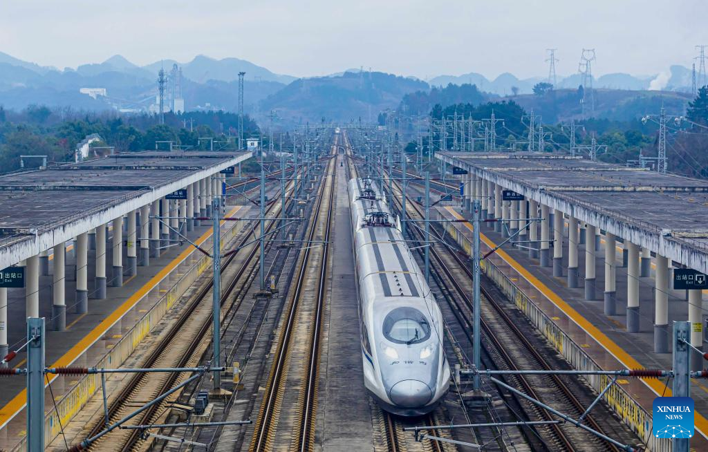 A bullet train runs past the Qianxi Railway Station in Qianxi, southwest China's Guizhou Province, Jan. 25, 2026. A new train schedule will be put into effect in China from Jan. 26. 2026. (Photo by Fan Hui/Xinhua)