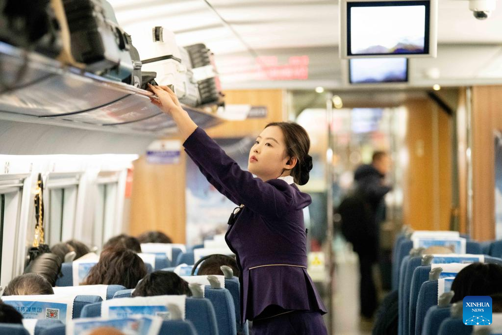 A steward works inside the compartment of train G2584 running from Taizhou to Beijing, Jan. 25. 2026. A new train schedule will be put into effect in China from Jan. 26. 2026. (Photo by Yang Yugang/Xinhua)