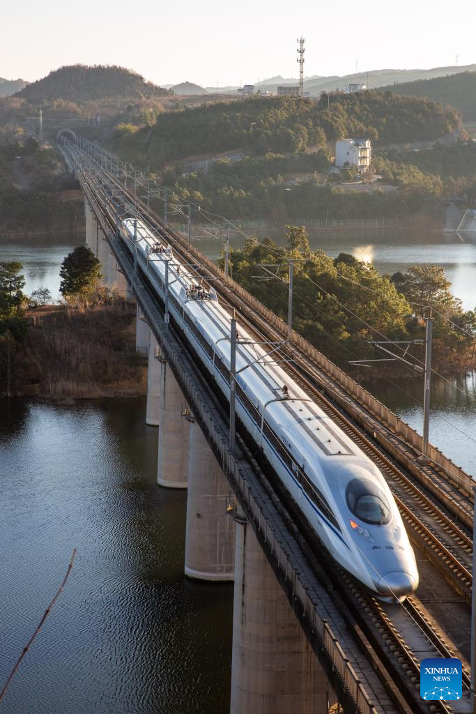A bullet train runs on tracks over a reservoir in Malong District of Qujing City, southwest China's Yunnan Province, Jan. 25, 2026. A new train schedule will be put into effect in China from Jan. 26. 2026. (Photo by Yang Junpeng/Xinhua)