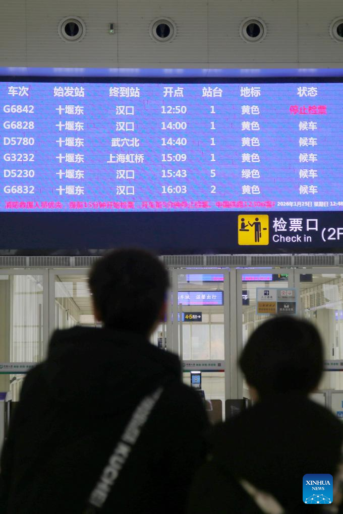 Passengers check train schedules on an electronic screen at Shiyan East Railway Station in central China's Hubei Province, Jan. 25, 2026. A new train schedule will be put into effect in China from Jan. 26. 2026. (Photo by Cao Zhonghong/Xinhua)