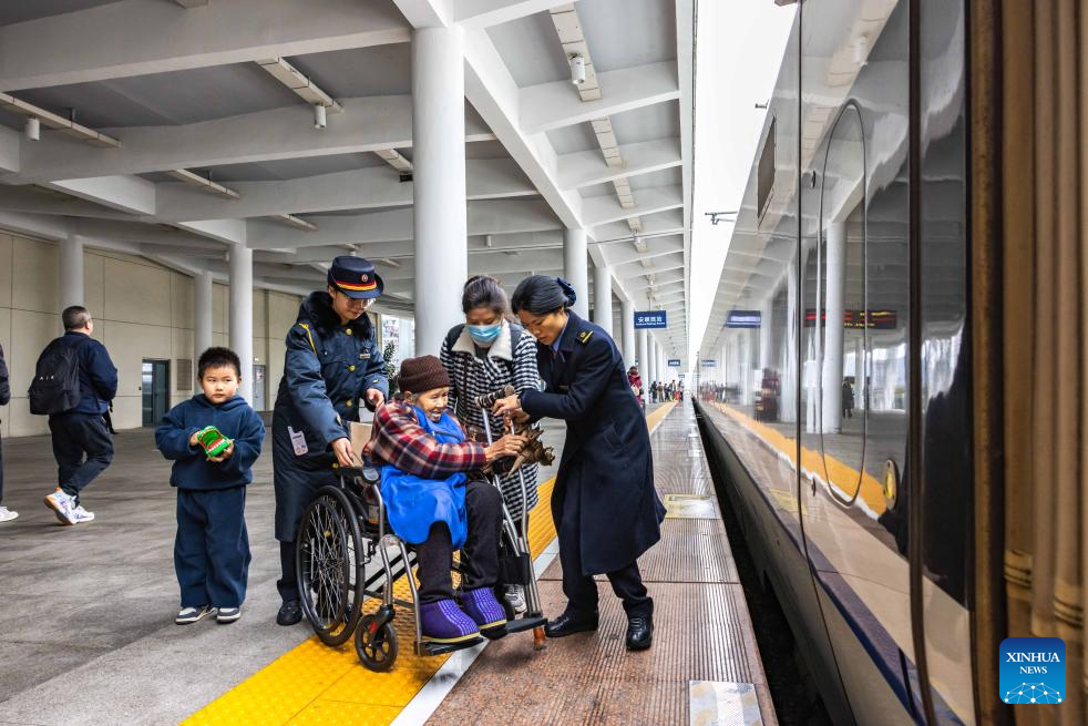 Train stewards help a senior passenger broad a train at Anshun West Railway Station in Anshun City, southwest China's Guizhou Province, Jan. 25, 2026. A new train schedule will be put into effect in China from Jan. 26. 2026. (Photo by Chen Xi/Xinhua)