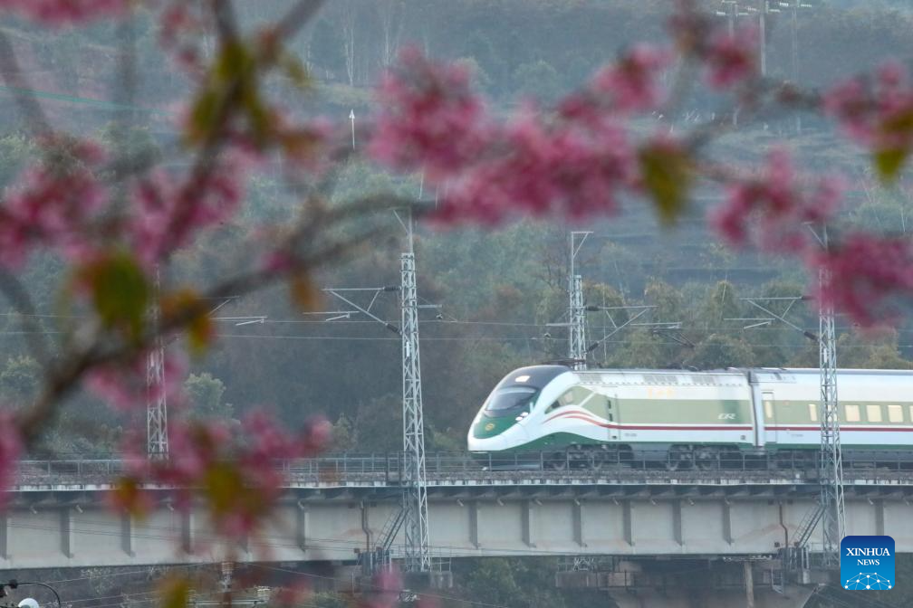 A bullet train runs on a section of the China-Laos Railway in Jinghong City of southwest China's Yunnan Province, Jan. 25, 2026. A new train schedule will be put into effect in China from Jan. 26. 2026. (Photo by Li Yunsheng/Xinhua)