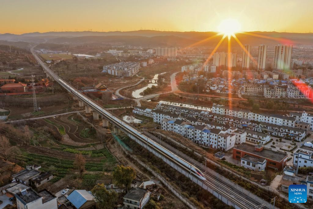 A drone photo taken on Jan. 25, 2026 shows a bullet train running in Qujing City, southwest China's Yunnan Province. A new train schedule will be put into effect in China from Jan. 26. 2026. (Photo by Sun Wenlai/Xinhua)