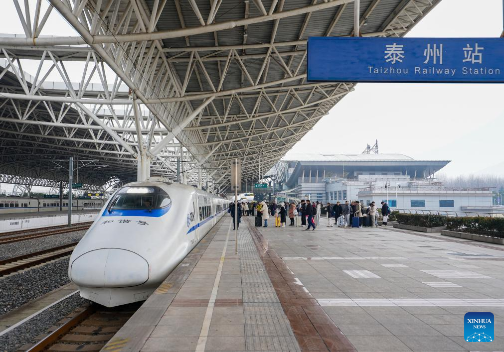 Passengers prepare to board a bullet train at Taizhou Railway Station in Taizhou City, east China's Jiangsu Province. A new train schedule will be put into effect in China from Jan. 26. 2026. (Photo by Zhou Shegen/Xinhua)