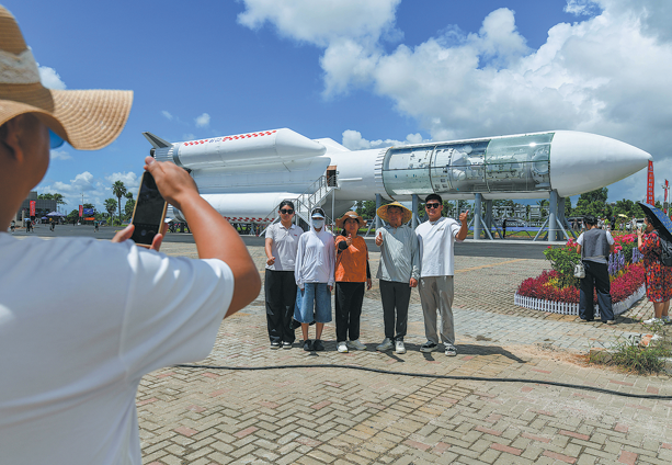 Tourists looking for an immersive interactive experience pose for a photo during a rocket stress test at the Wenchang Spaceflight Science Center on Oct 3. LUO YUNFEI/CHINA NEWS SERVICE