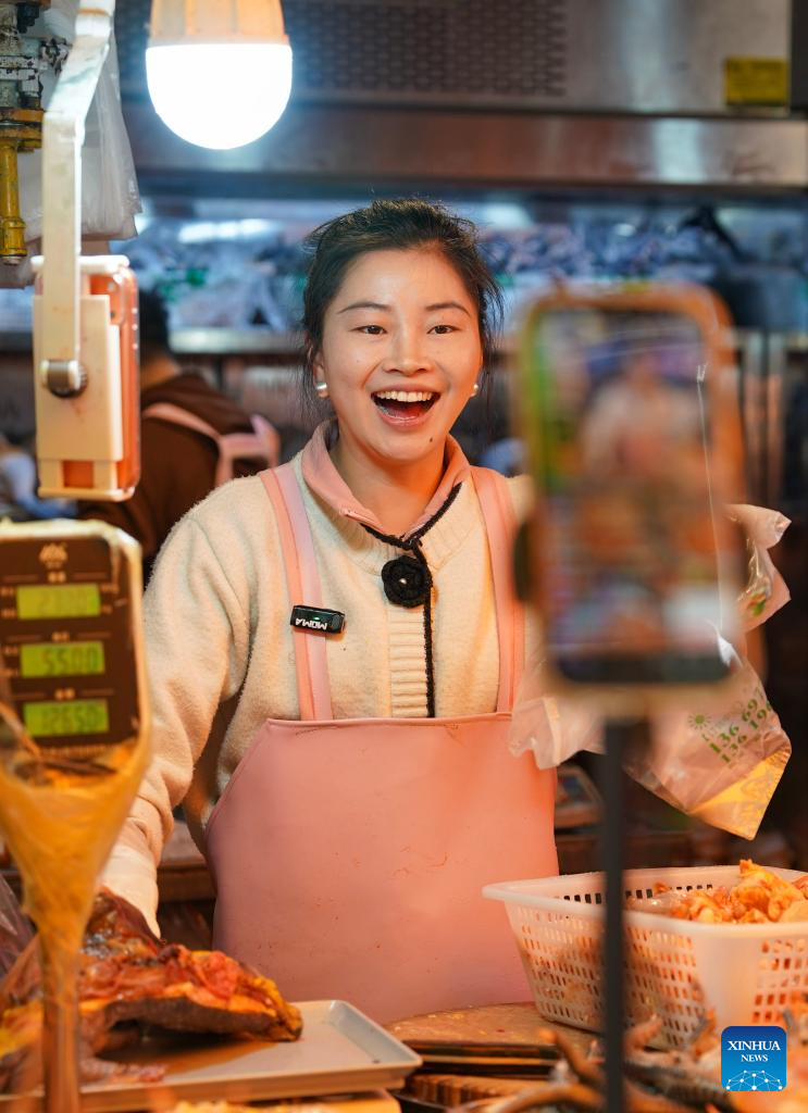 A vendor sells marinated meat at Daguan Zhuanxin farmers' market in Kunming, southwest China's Yunnan Province, Jan. 27, 2026. While preserving the original function of a farmers' market, Daguan Zhuanxin farmers' market has now been upgraded to a complex of cultural experience, dining and entertainment, which offers tourists a window to experience local flavor and vibe. (Xinhua/Chen Xinbo)