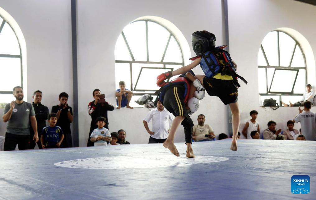 Yemeni junior competitors fight during a Wushu and Kung Fu competition in Sanaa, Yemen, on Jan. 28, 2026. (Photo by Mohammed Mohammed/Xinhua)