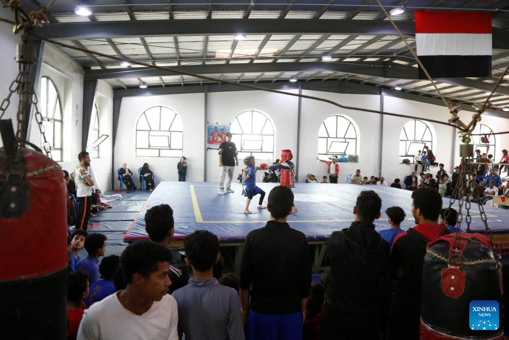 People watch as competitors fight during a Wushu and Kung Fu competition in Sanaa, Yemen, on Jan. 28, 2026. (Photo by Mohammed Mohammed/Xinhua)