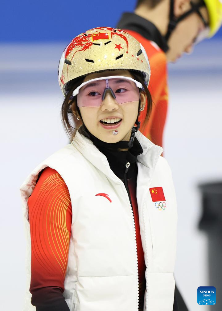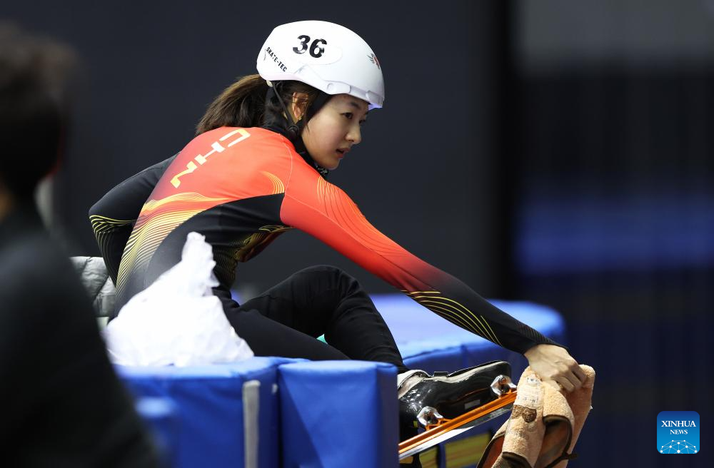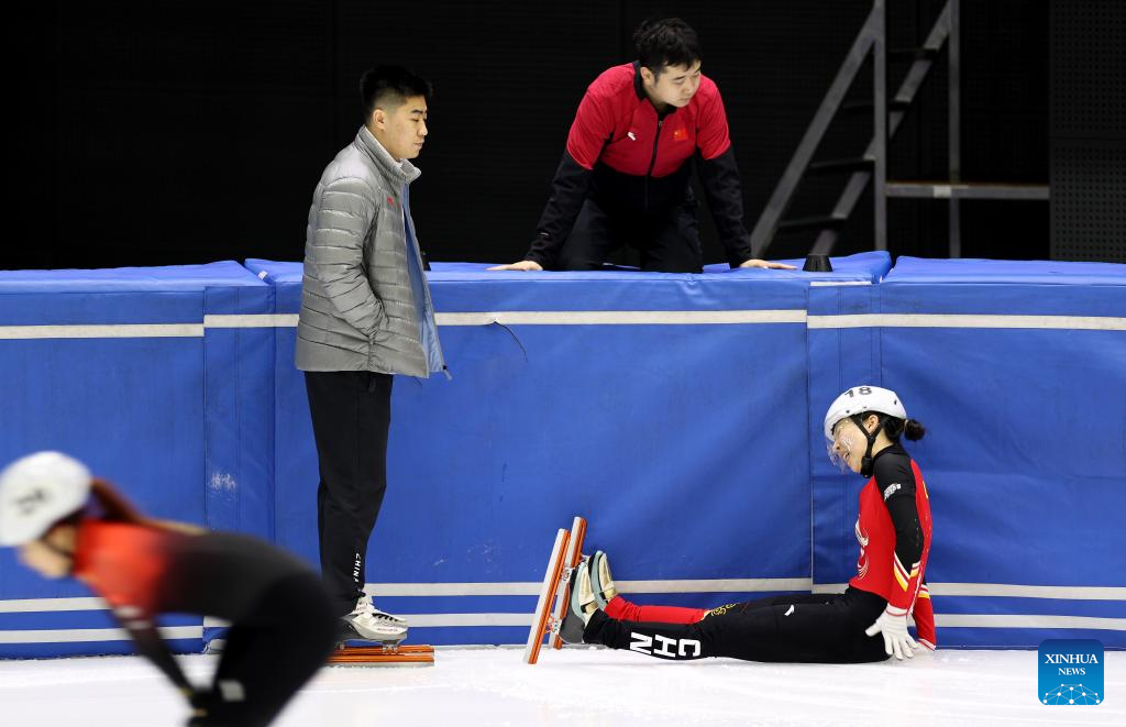 Chinese short track speed skater Wang Xinran reacts during a training session ahead of the upcoming Milan-Cortina 2026 Winter Olympics in Beijing, China, Jan. 29, 2026. (Xinhua/Li Ming)