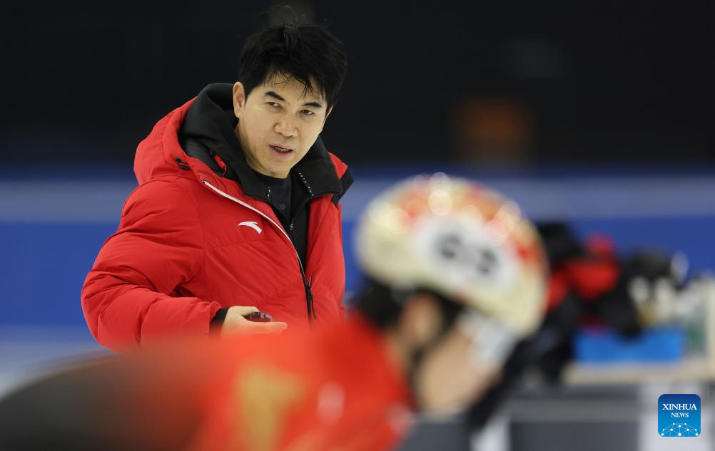 Zhang Jing (C), head coach of China's short track speed skating team, speaks during a training session ahead of the upcoming Milan-Cortina 2026 Winter Olympics in Beijing, China, Jan. 29, 2026. (Xinhua/Zhang Chen)