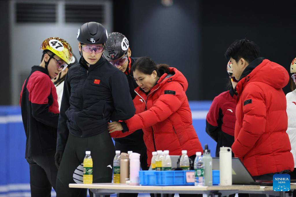 Zhang Jing (C), head coach of China's short track speed skating team, adjusts Liu Shaoang's suit during a training session ahead of the upcoming Milan-Cortina 2026 Winter Olympics in Beijing, China, Jan. 29, 2026. (Xinhua/Zhang Chen)