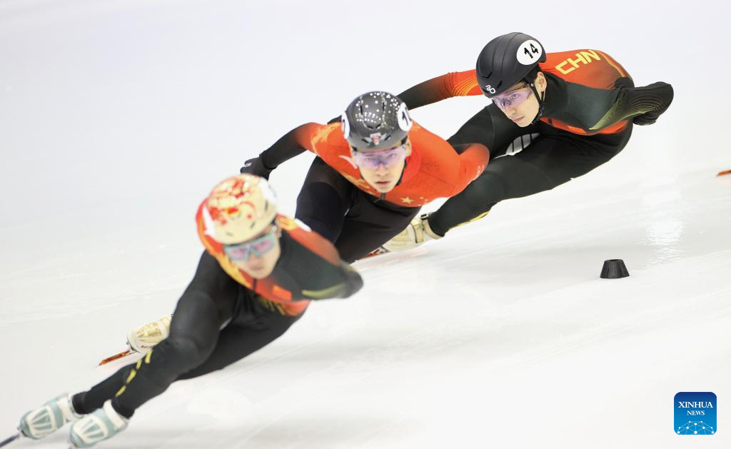 Chinese short track speed skater Li Wenlong (2nd L) attends a training session ahead of the upcoming Milan-Cortina 2026 Winter Olympics in Beijing, China, Jan. 29, 2026. (Xinhua/Zhang Chen)