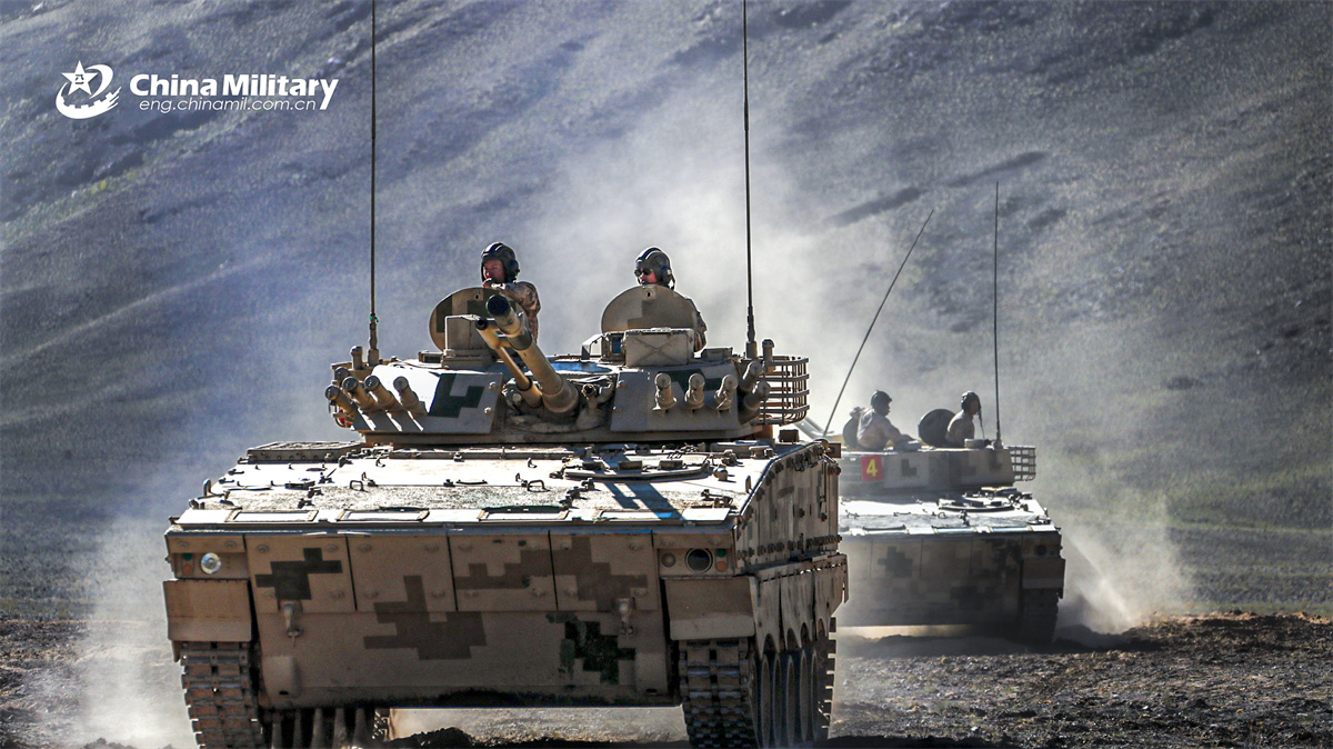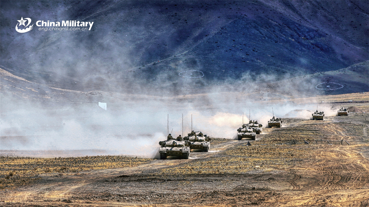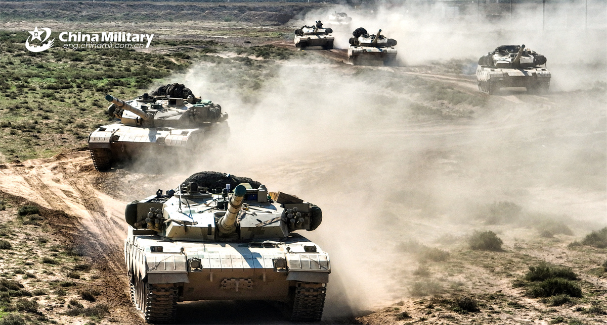 ZTZ-96A main battle tanks (MBTs) attached to a brigade under the Chinese PLA 77th Group Army maneuver to the designated area during a full-element combat training exercise in mid-January, 2026. (eng.chinamil.com.cn/Photo by Huang Wei, Jing Fulin and Liu Haorui)