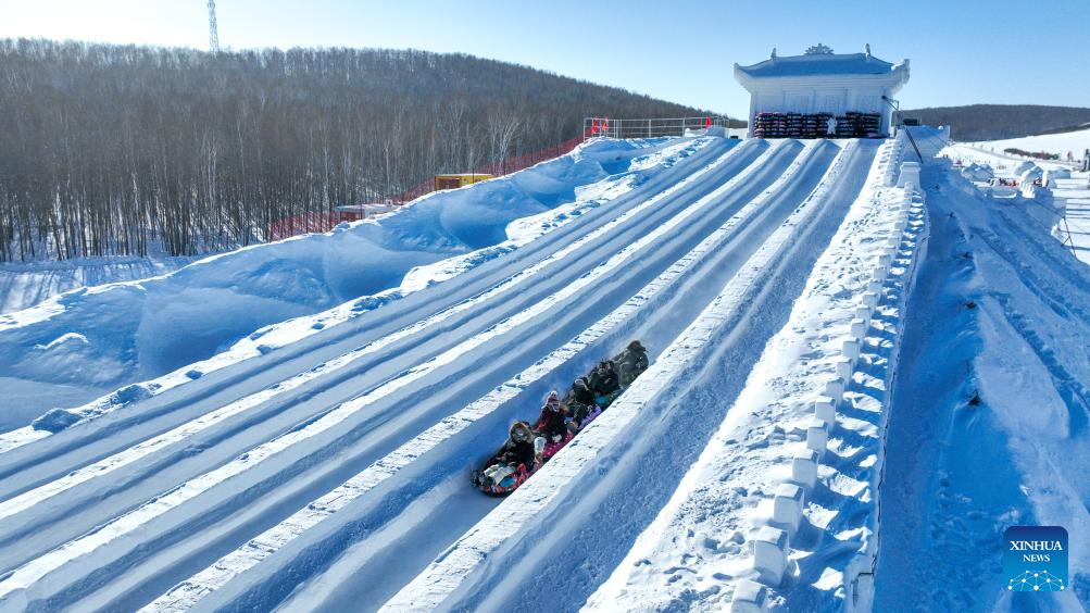 An aerial drone photo taken on Jan. 21, 2026 shows tourists enjoying snow tubing at the Phoenix Mountain scenic area in Yakeshi of Hulun Buir, north China's Inner Mongolia Autonomous Region. Yakeshi has been an important base for cold-area automotive testing due to its long and freezing winter season. A large number of engineers and technicians pay regular visit for business purpose to the city during the winter, but they also become a stable client group for other services available here.
