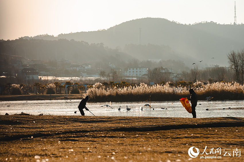 Staff members feed migratory birds at the Lashihai wetland park in Lijiang, southwest China's Yunnan Province. (Photo/Xu Jun)