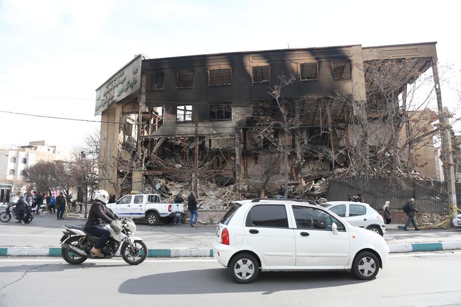 Vehicles pass in front of a tax administration building damaged during recent unrest in Tehran, Iran, Jan. 21, 2026. (Xinhua/Shadati)