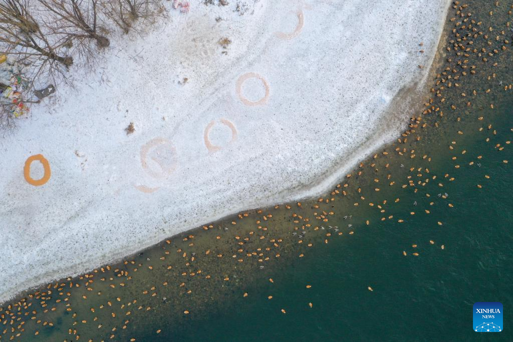 An aerial drone photo taken on Jan. 28, 2026 shows a large number of birds inhabiting Changbai Island in Jilin City, northeast China's Jilin Province. (Xinhua/Zhang Nan)