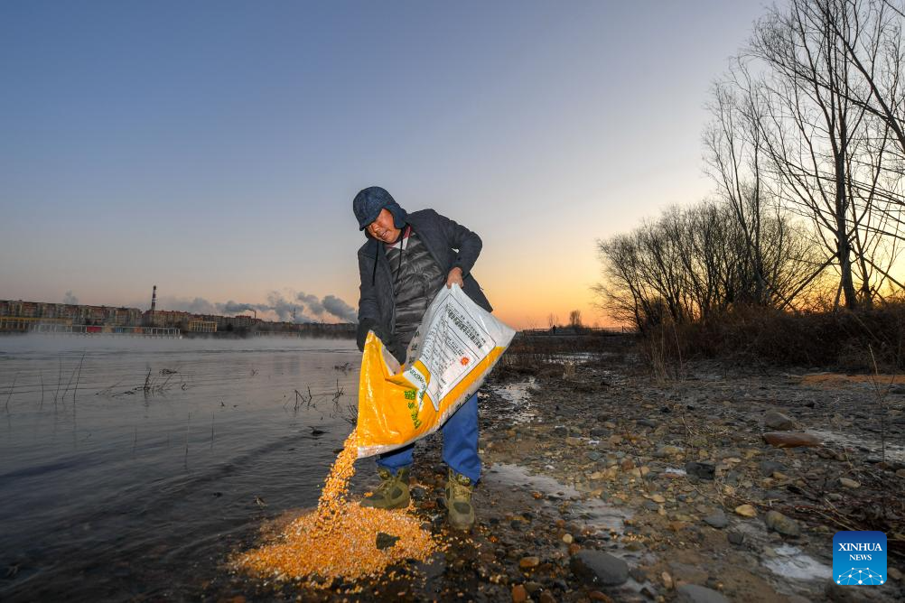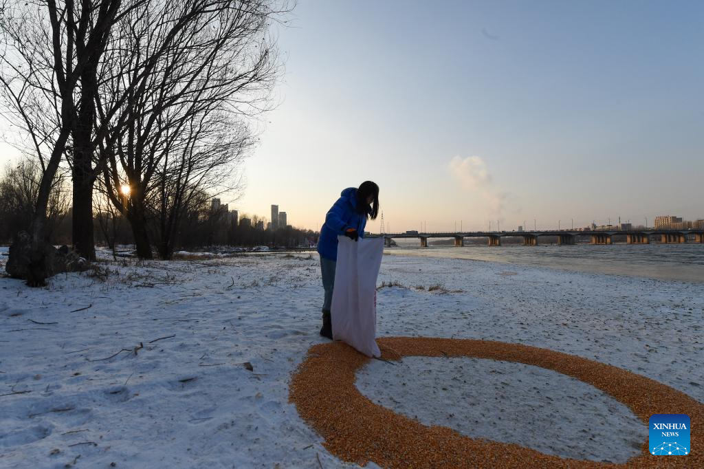 Wang Tingting feeds birds on Changbai Island in Jilin City, northeast China's Jilin Province, Jan. 28, 2026. (Xinhua/Zhang Nan)
