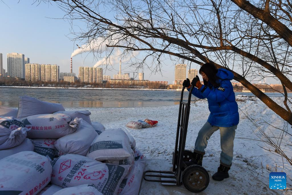 Wang Tingting transfers bird food on Changbai Island in Jilin City, northeast China's Jilin Province, Jan. 28, 2026. (Xinhua/Zhang Nan)