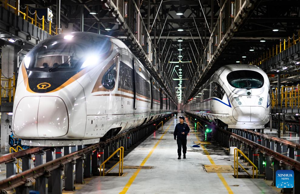 Li Qiwei (L) works with his colleagues at an electric multiple unit (EMU) maintenance depot in north China's Tianjin Municipality, on Feb. 2, 2026. Several EMU trains are neatly lined up for "health checkups" inside a maintenance depot in Tianjin at the night of Feb. 1, right before the start of Spring Festival travel rush, the annual homeward journey in China, and also the world's largest human migration.