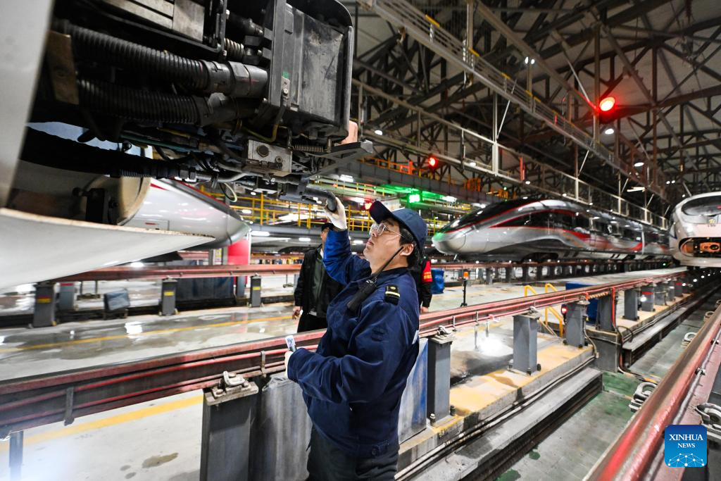 Li Qiwei works at an electric multiple unit (EMU) maintenance depot in north China's Tianjin Municipality, on Feb. 1, 2026. Several EMU trains are neatly lined up for "health checkups" inside a maintenance depot in Tianjin at the night of Feb. 1, right before the start of Spring Festival travel rush, the annual homeward journey in China, and also the world's largest human migration.