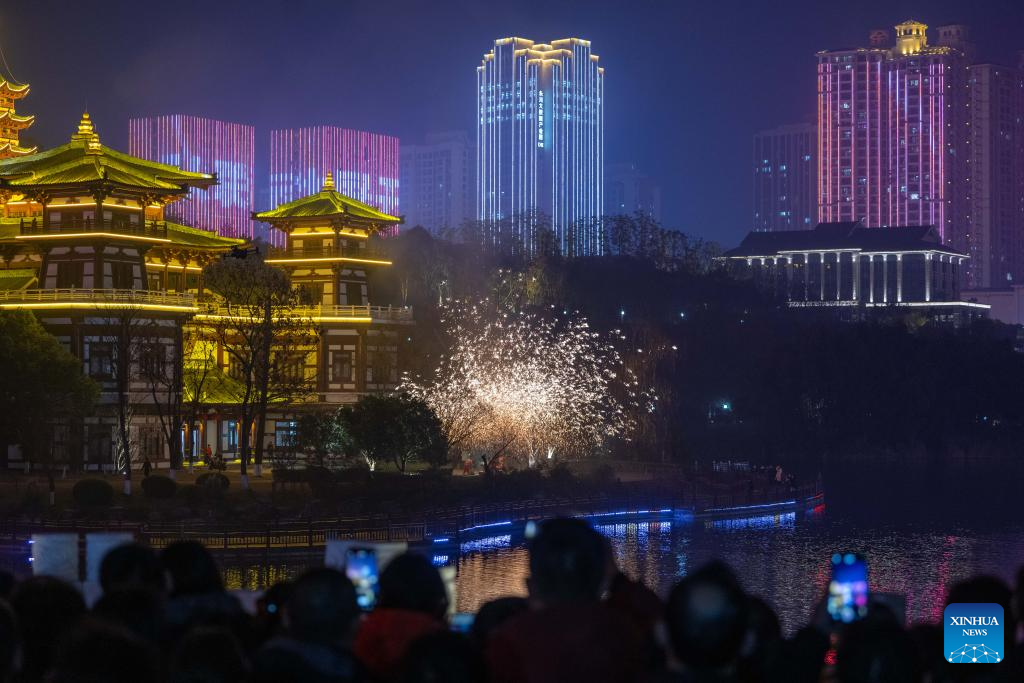 People watch a molten iron firework show at a park in southwest China's Chongqing Municipality, Feb. 5, 2026. A fair featuring Chinese New Year goods kicked off here on Thursday, offering residents a one-stop destination for New Year shopping with diverse choices. (Xinhua/Chen Cheng)