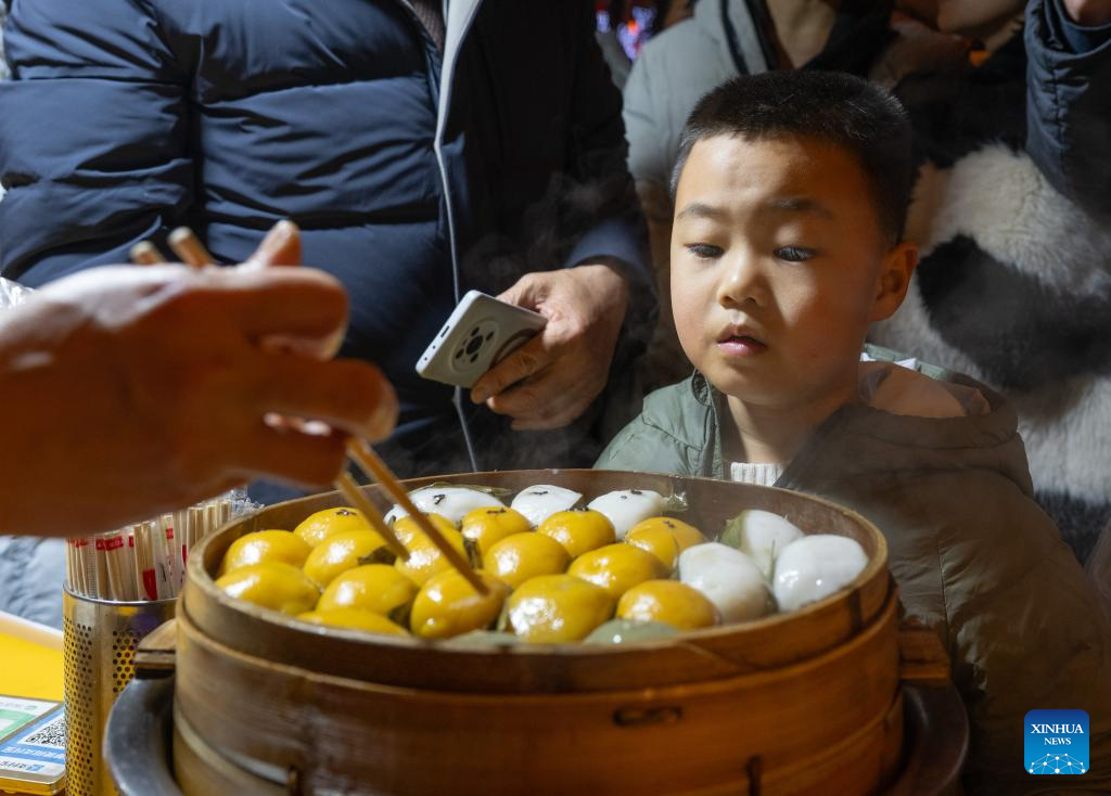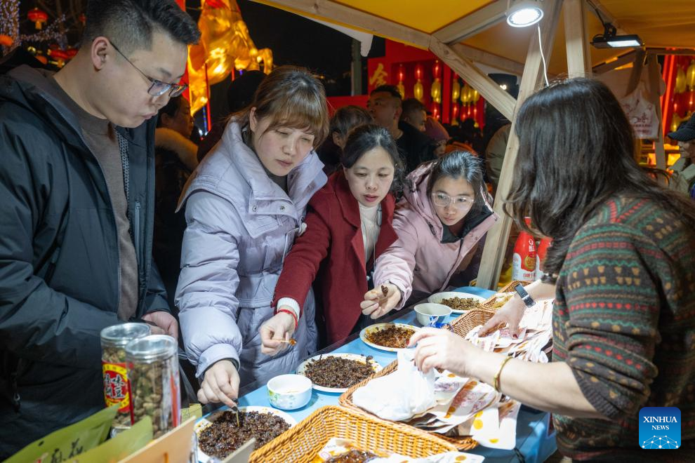 A child is attracted by snacks at a fair featuring Chinese New Year goods in southwest China's Chongqing Municipality, Feb. 5, 2026. A fair featuring Chinese New Year goods kicked off here on Thursday, offering residents a one-stop destination for New Year shopping with diverse choices. (Xinhua/Chen Cheng)