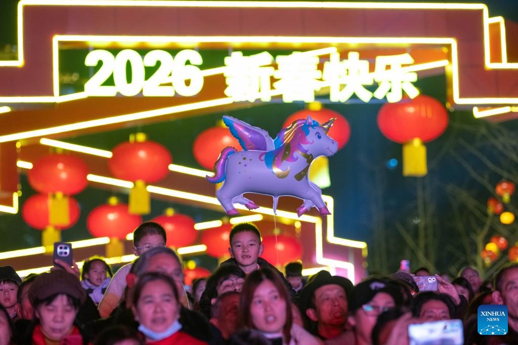 People perform at the opening ceremony of a fair featuring Chinese New Year goods in southwest China's Chongqing Municipality, Feb. 5, 2026. A fair featuring Chinese New Year goods kicked off here on Thursday, offering residents a one-stop destination for New Year shopping with diverse choices. (Xinhua/Chen Cheng)