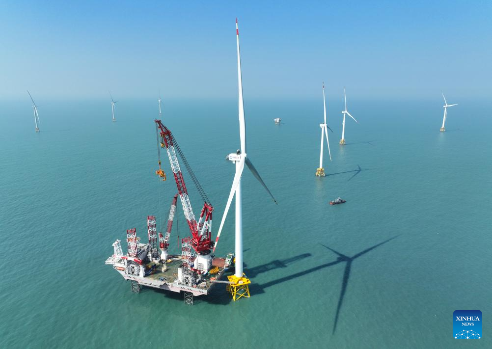 A drone photo taken on Jan. 13, 2026 shows part of an offshore wind turbine unit on the waters of southern Fujian in southwest China. A 20-megawatt offshore wind turbine unit was put into operation on the waters of southern Fujian on Thursday, and was successfully connected to the grid for power generation. (Xinhua/Lin Shanchuan)