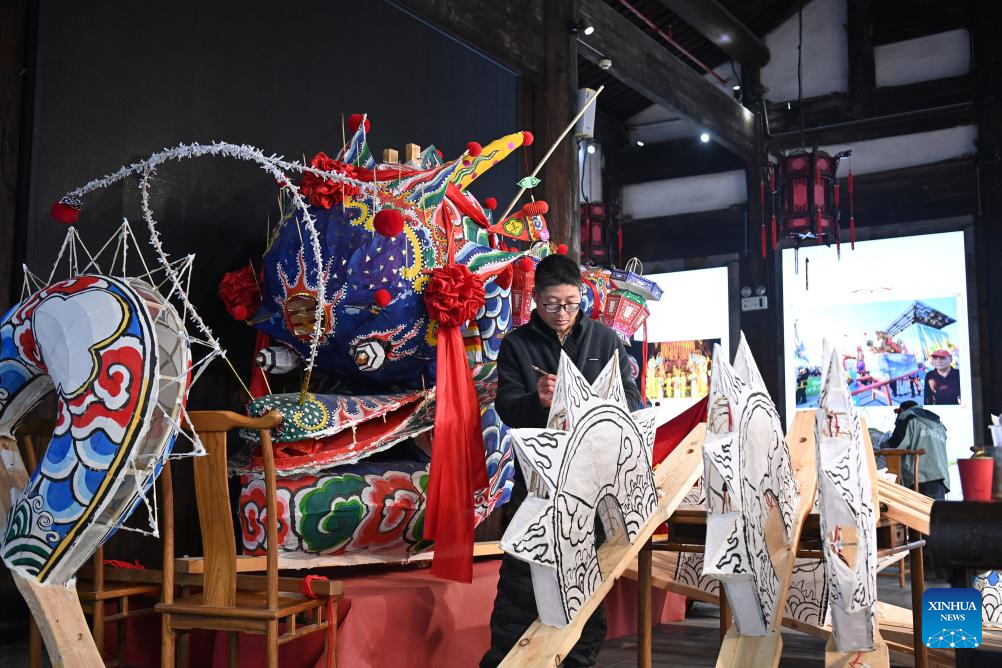 A staff makes dragon lanterns for the upcoming Spring Festival at a scenic spot in Dongyang City, east China's Zhejiang Province, Feb. 5, 2026. With the Spring Festival drawing near, various festive events are held across the country to celebrate the Chinese New Year. (Photo by Bao Kangxuan/Xinhua)