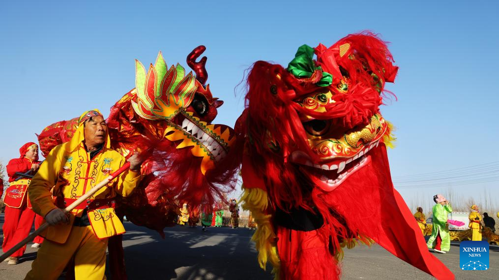 A Shehuo team performs lion dance at a square in Zhangye City, northwest China's Gansu Province, Feb. 5, 2026. With the Spring Festival drawing near, various festive events are held across the country to celebrate the Chinese New Year. (Photo by Chen Li/Xinhua)