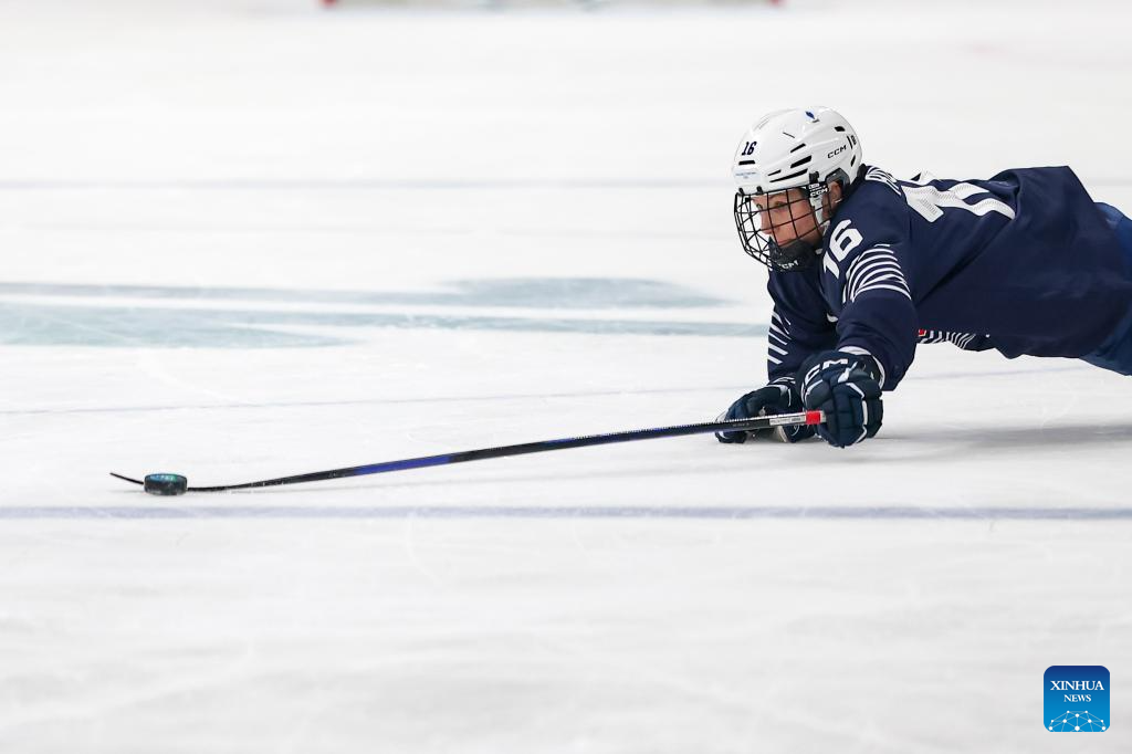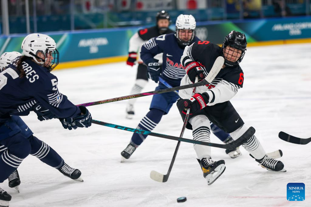Sato Kohane (R) of Japan competes during the Women's Preliminary Round Group B match between France and Japan of Ice Hockey of the 2026 Milan-Cortina Olympic Winter Games in Milan, Italy, Feb. 6, 2026. (Zhang Cheng/Pool via Xinhua)