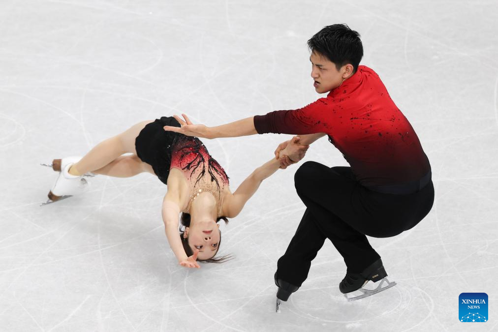 Miura Riku (L)/Kihara Ryuichi of Japan compete during the figure skating team event pair skating short program of the Milan-Cortina 2026 Olympic Winter Games in Milan, Italy, Feb. 6, 2026. (Xinhua/Chen Yichen)