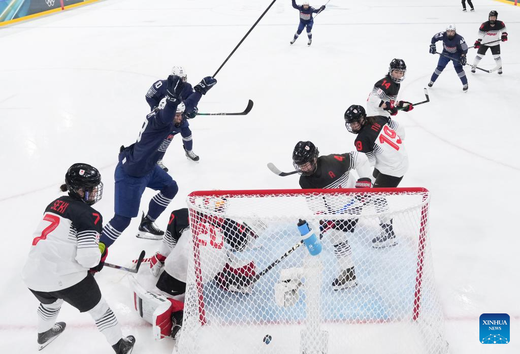 Players of Japan celebrate a goal during the Women's Preliminary Round Group B match between France and Japan of Ice Hockey of the 2026 Milan-Cortina Olympic Winter Games in Milan, Italy, Feb. 6, 2026. (Zhang Cheng/Pool via Xinhua)
