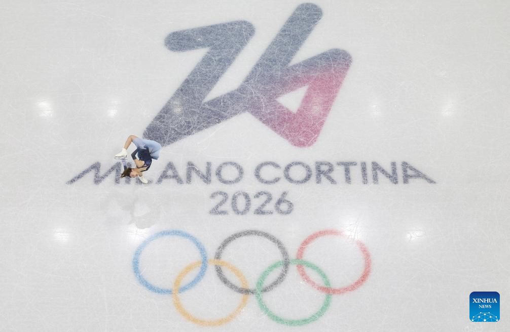 Ioulia Chtchetinina (L)/Michal Wozniak of Poland compete during the figure skating team event pair skating short program of the Milan-Cortina 2026 Olympic Winter Games in Milan, Italy, Feb. 6, 2026. (Xinhua/Cheng Min)