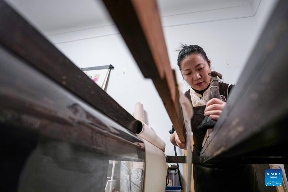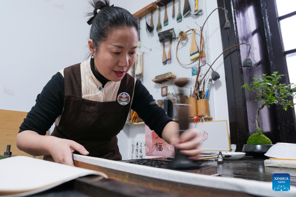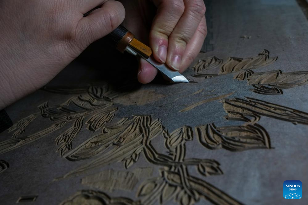 Qiao Lanrong, an inheritor of Taohuawu woodblock New Year prints, makes a woodblock for New Year prints at her studio in Suzhou, east China's Jiangsu Province, Feb. 5, 2026.