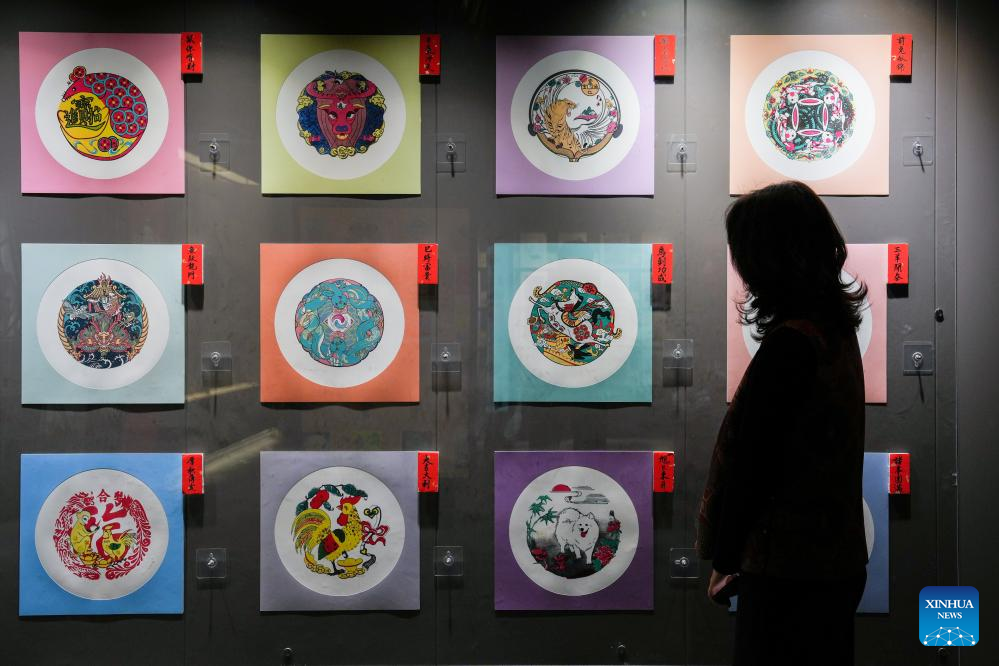 A woman visits an exhibition on Taohuawu woodblock New Year prints on Pingjiang Road in Suzhou, east China's Jiangsu Province, Feb. 5, 2026.