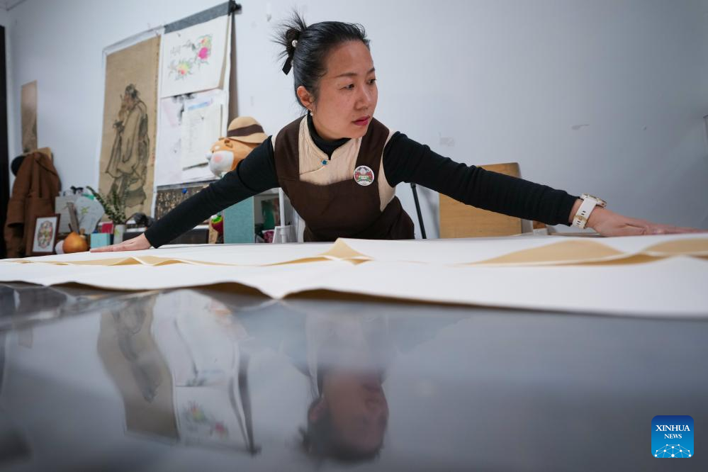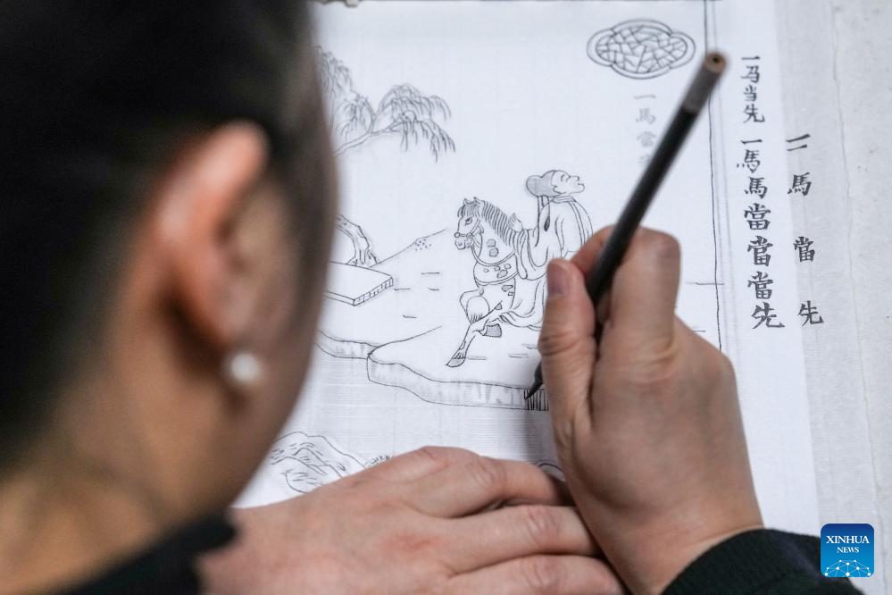 Qiao Lanrong, an inheritor of Taohuawu woodblock New Year prints, designs patterns for a New Year print at her studio in Suzhou, east China's Jiangsu Province, Feb. 5, 2026.