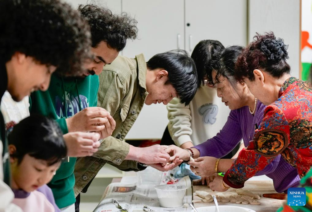 International students of North Minzu University make dumplings together with local residents in Yinchuan, northwest China's Ningxia Hui Autonomous Region, Feb. 5, 2026. As the Spring Festival approaches, international students from North Minzu University were invited to a community in Yinchuan to experience traditional Chinese folk customs and share the festive joy of the Chinese New Year with local residents. (Xinhua/Yang Zhisen)