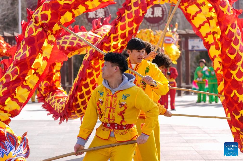 International students of North Minzu University experience dragon dance in Yinchuan, northwest China's Ningxia Hui Autonomous Region, Feb. 5, 2026. As the Spring Festival approaches, international students from North Minzu University were invited to a community in Yinchuan to experience traditional Chinese folk customs and share the festive joy of the Chinese New Year with local residents. (Xinhua/Yang Zhisen)